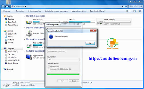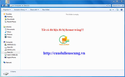 Ổ cứng G đã bị format mất hết dữ liệu rồi. bây giờ mình bắt đầu mở chương trình cứu dữ liệu lên :