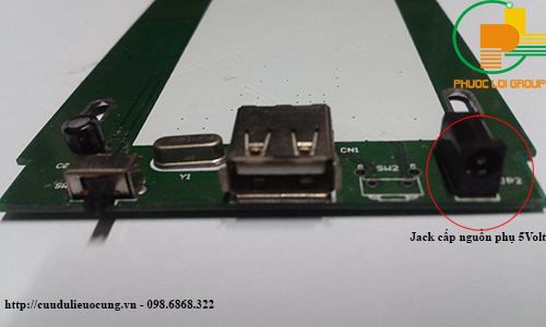 Với chuẩn USB 1.0 ngày xưa dòng điện cấp ra rất nhỏ, chính vì thế mà sợi dây USB kết nối có 3 đầu, 1 đầu cắm vào box và 2 đầu còn lại là cắm vào máy vi tính. Tại đâu mình xin lưu ý là nếu có anh chị em nào vẫn còn đang sử dụng box loại này thì chú ý. Đầu dây chính phải được kết nối với máy vi tính thì máy vi tính mới detect được box. Đầu cắm còn lại chỉ là ngõ cắm để cấp thêm nguồn cho box mà thôi. Nếu chúng ta chỉ cắm ngõ này thì máy vi tính không detect được ổ cứng box. Trong trường hợp chúng ta cắm 1 ngõ chính vào mà nghe ổ đĩa cứng trong box không quay lại có tiếng motor nhích nhích nhẹ thì phải nhanh chóng rút dây cắm ra vì nếu để lâu có thể chết ổ cứng. Cách sử dụng đúng đó là phải cắm 2 dây chính và phụ vào ngõ usb của máy vi tính sau đó mới cắm ngõ kia vào box và làm ngược lại khi rút ra. Trong một vài trường hợp dù cắm cả 2 ngõ chính và phụ ta vẫn nghe tiếng ổ đĩa cứng click click không quay được mâm đĩa. Đó có thể là do loại ổ đĩa cứng mà chúng ta sử dụng trong box có mức tiêu thụ điện cao ( thường là nhiều mặt đĩa ) hoặc là máy vi tính của chúng ta đang sử dụng loại main board có dòng điện cung cấp tại ngõ USB thấp. Cho dù là nguyên nhân nào thì lúc đó chúng ta không thể sử dụng box ổ cứng đó được. chính vì thế mà có một ngõ cấp nguồn nữa cho box ổ cứng. Các bạn nhìn lại hình bên trên sẽ thấy mình có khoanh tròn màu đỏ và ghi chú là : "jack cấp nguồn phụ 5 Volt. Phải sử dụng đúng loại Adapter DC 5Volt có phân biệt cực dương âm đúng với quy định của box, nếu bạn không biết rõ nên nhờ kỹ thuật tư vấn. Chính vì tại chổ này mà anh khách hàng của mình đã nhầm lẫn và cắm nhầm nguồn. Anh cứ nghĩ nguồn là 12volt như những box ổ cứng cho dòng 3.5". Với dòng box cho ổ cứng 3.5" nguồn cấp phải là 12Volt vì bản thân ổ đĩa cứng PC ( 3.5" ) sử dụng nguồn 12volt và 5volt. Nhưng dòng ổ cứng laptop ( 2.5" ) thì chỉ sử dụng nguồn 5 Volt. Bây giờ chúng ta cùng phân tích xem khi cắm nhầm nguồn như vậy chuyện gì sẽ xảy ra. Nếu box ổ cứng là loại tốt thì có thể nó sẽ đứt cầu chì bảo vệ. hoặc chỉ chết Fet nguồn ngay đầu ngồn cấp vào. Đây chỉ là box ổ cứng chất lượng trung bình. Phần nguồn đi trực tiếp từ jack cắm thẳng vào chip chứ không có mạch Fet nguồn bảo vệ. Có một điện trở cầu chì ký hiệu là R5, nhưng rất tiếc nó đã không đứt khi cần thiết, và hậu quả là chip chính bị cháy ( mình có khoanh tròn màu đỏ ). Như vậy điều chắc chắn là box ổ cứng này đã hư hỏng nặng. Việc tiếp theo phải xem xét đến ổ đĩa cứng gắn bên trong box này.