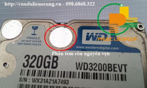 Đây là một ổ đĩa cứng còn jin chưa bung cơ. Phần những miếng nhựa tròn màu đen được dán lên trên những con ốc bắt chặt nắp của ổ đĩa cứng với phần cơ bên dưới. Chúng ta nhìn thấy những miếng dán này rất thẳng thớm, không có dấu hiệu bị biến dạng. Khi có tác động bên ngoài nhất là cố tình bóc tách, cạy ra thì những miếng nhựa này sẽ có tì vết. Bên dưới vòng tròn màu đỏ là một con ốc vít được bắt thẳng vào phần cụm đầu đọc bên trong. Muốn tháo rời phần nắp đậy chúng ta bắt buộc phải mở con ốc này. Trước tiên phải mở phần nhãn dán, như vậy khi ổ cứng bị bung cơ thì những chổ này sẽ để lại dấu vết do bị tác động. Trong một vài trường hợp không có các miếng dán bằng nhựa này, nhất là đối với ổ đĩa cứng hiệu Seagate hay Samsung, dường như các miếng dán này chỉ có ở Western mà thôi, vậy thì làm sao? Chỉ còn cách quan sát kỹ phần nhãn dán và ngay chổ con ốc ẩn dấu bên dưới, muốn mở nó bắt buộc phải phá hỏng phần tem dán bên trên. Như vậy nếu bạn chịu xem xét kỹ sẽ phát hiện được. Còn nếu như đây là loại ổ đĩa cứng được một trung tâm sửa chữa chuyên nghiệp thực hiện rồi dán nhãn lên thì . . . đành chịu. Chúng tôi cũng đã gặp nhiều loại này khi khách mang đến cứu dữ liệu. Đây là loại được sửa chữa từ một nhà máy tại Trung Quốc. bên ngoài nhìn cực kỳ mới, nhãn dán thật là đẹp và phải nói là " y như jin" thế nhưng khi dùng tool chuyên dụng đọc các thông số thì mới biết là tem dán tên nọ mà ruột thì tên kia!!! Thậm chí ổ đĩa cứng Western mà nhãn dán là Seagate, mà nhãn dán thật đẹp và như jin mới kinh chứ.Thật khó khăn cho công tác cứu dữ liệu nhất là khi ổ đĩa cứng không còn detect, việc nhận định đúng chủng loại để tìm đầu đọc phù hợp thay vào là một việc vô cùng khó khăn. Cho nên vẫn muốn nhắc lại một câu mà người anh em chúng tôi luôn nhắc đó là :" Đừng ham giá rẻ!" Thật sự mà nói khó có cái gì vừa ngon rẻ mà bổ hay nói gọn lại là không có cái gì " thơm" hết, cái gì rẻ mà có vẻ "thơm" thì hãy coi chừng, nó có lý do của nó, và có hậu quả của nó, nhất là khi chúng ta muốn lưu trữ dữ liệu quan trọng của mình.