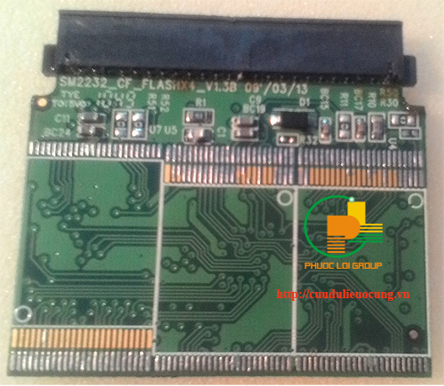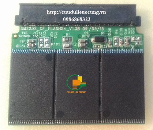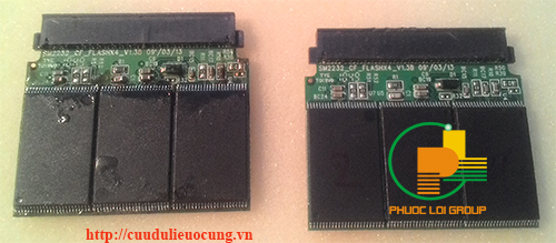Đây là thẻ nhớ CF, loại này có chip I/O ( cũng có thể gọi là chip firmware ). Có 2 mặt tổng cộng 4 chip flash ( chip nhớ) dung lượng mỗi chip nhớ là 4Gb vậy tổng lại thẻ nhớ này có dung lượng là 16Gb. Tại trung tâm chúng tôi có một thẻ nhớ cùng loại nên chúng tôi tiến hàng thay chip để loại suy chip nào bị hư hỏng. Các bạn nhìn thấy ở hình trên chip I/O có 4 hàng chân và chip nhớ chỉ có 2 hàng chân, như vậy việc thay chip I/O sẽ phức tạp hơn là thay chip nhớ. Vì thế chúng tôi chọn hình thức thay chip nhớ.