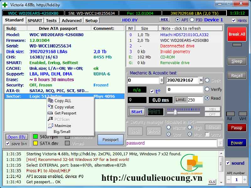Giao diện chính của chương trình test sửa ổ cứng Victoria: