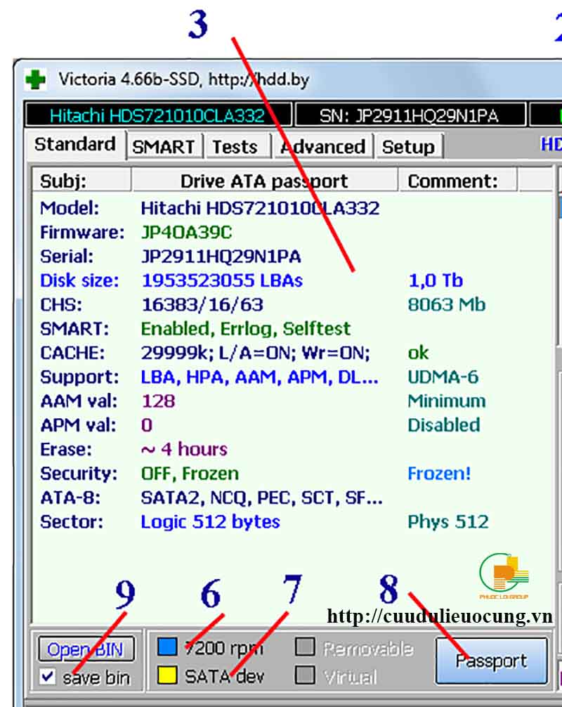 9 - save bin . Nếu nó được chọn, chương trình sẽ lưu cấu trúc với passport vào thư mục bằng nhật ký, từ đó nó có thể được trích xuất bất kỳ lúc nào và được tải vào chương trình bằng nút Open BIN. Bằng cách này, bạn có thể xem xét các đặc điểm của một ổ đĩa vật lý bị thiếu hoặc gửi một tập tin passport để nghiên cứu.