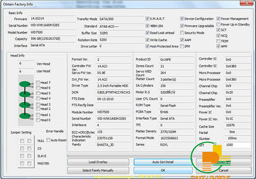 Chuyện xảy ra cũng là một điều đáng để anh em rút kinh nghiệm. Một hôm nhận được một ca cứu dữ liệu ổ cứng không detect, đó là một ổ cứng laptop hiệu Western. Như tôi cũng đã có nói nhiều rồi, trường hợp ổ đĩa cứng không nhận, hay còn gọi là không detect có rất là nhiều nguyên nhân. Ngoài cái chuyện cháy board, cháy chip, hư motor, hư board, hư đầu đọc... nó còn có một trường hợp là bị hư Rom nữa. Trong trường hợp mà tôi lấy ra làm thí dụ ở đây là trường hợp điển hình. Sau khi kiểm tra phần board mạch chúng tôi nhận thấy không có dấu hiệu gì của sự cháy nổ linh kiện cả. Khi cấp nguồn thì ổ cứng im ru không hề có phản ứng gì hết cả. lấy một board mạch khác gắn vào thì ổ cứng có khởi động ( tức là motor có quay ). Dùng phương pháp gắp chip Rom chuyển đổi qua thì cái board im ru giờ lại quay còn cái board lúc nãy quay giờ lại im ru. Như vậy ta dễ dàng kết luận là con Rom nguyên thủy của ổ cứng cần lấy dữ liệu đã bị chết. Có thể là chip Rom bị lỗi hoặc là chết hẳn luôn. Anh em kỹ thuật lưu ý nha, Chip Rom của main bị chết có nghĩa là có thể nó bị chết chip về phương diện vật lý, cũng có thể vì lý do gì đó mà dữ liệu bên trong bị mất và khi đó dù chúng ta hàn chip vào bất cứ board nào cũng sẽ...im ru! Trong trường hợp này chúng ta tìm một board mạch có số PBC giống với board của ổ đĩa cứng cần cứu dữ liệu. Khi gắn board có cùng số PBC vào chúng ta sẽ nhận được thông số detect như sau :