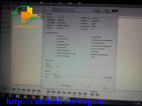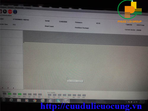 Chúng ta nhìn thấy sau khi xử lý Rom thì đọc được tên tuổi của ổ cứng nhưng phần thông số chi tiết như số lượng đầu đọc, dung lượng ổ đĩa thì vẫn chưa đọc được. ( Hình này mình phải dùng điện thoại chụp bên máy chạy tool fix lỗi firmware nên hơi mờ anh em thông cảm.
