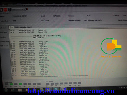 Sau khi nạp firmware thành công chúng ta thấy bây giờ ổ đĩa cứng đã thể hiện đầy đủ thông số như model serial number, phiên bản firmware, số đầu đọc là 2 ( có 2 đầu ) và số LBA tức dung lượng ổ cứng. Tới đây chúng tôi mừng vô cùng vì nếu thông thường thì giờ ổ cứng có thể truy xuất được. nhưng lại thêm một lần nữa thất vọng. Sau khi đưa vào thiết bị trích xuất dữ liệu thì gần như treo máy. Test bad sector thì ôi thôi bad từ đầu tới cuối... test một hồi ổ cứng lại lăn đùng ra chết, không nhận nữa... vậy là công toi. Trường hợp này đã quá rõ. Như vậy nguyên nhân chính là đầu đọc đã bị lão hóa theo thời gian và do vậy nó không truy xuất được phần firmware, mình cố ép nó nó hồi sinh thở được mấy cái rồi ngất lịm luôn. Phải tiến hành ca mổ gấp: